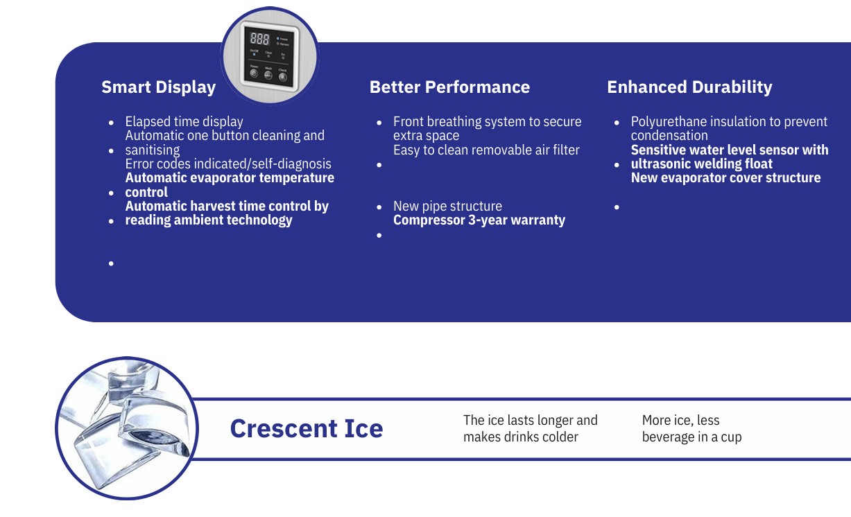 Modular ice machine, Air-cooled condenser, Crescent ice, Stainless steel inside, Digital temperature control system, 115 V / 60 Hz, 220~240 V / 50 & 60 Hz